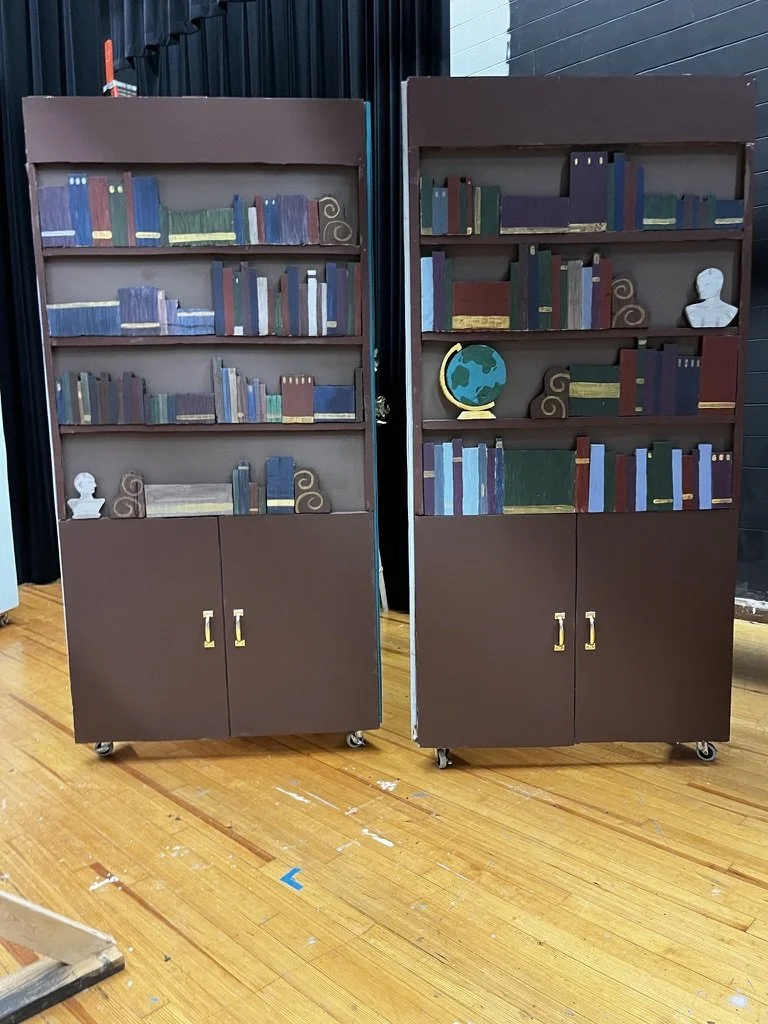 Hand-cut and painted styrofoam bookshelf facades.